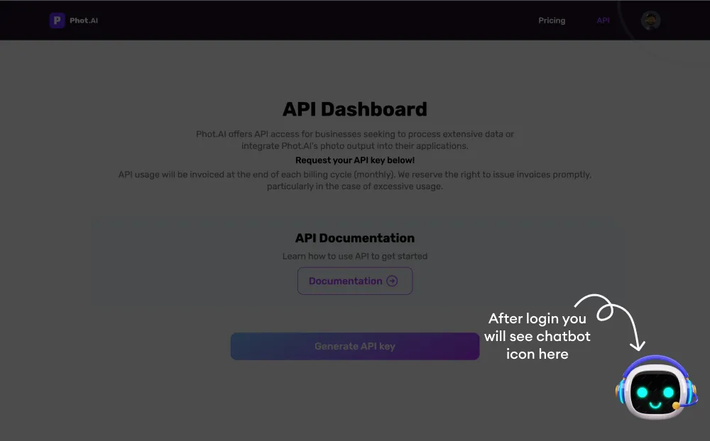 After logging in to Phot.ai, look for the chat icon at the bottom right corner of your screen. Click it to open Mr. Pho.