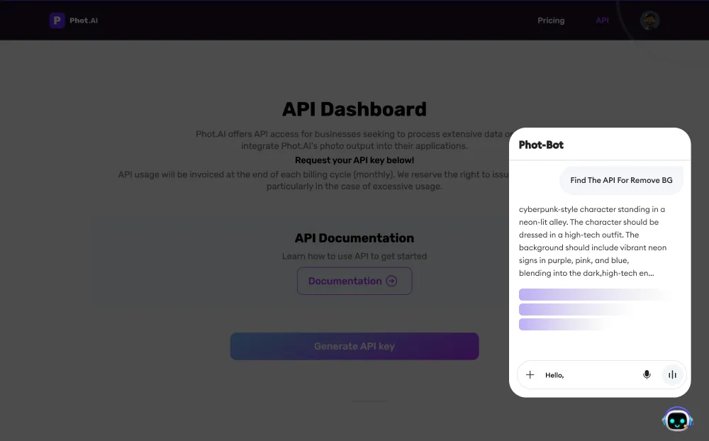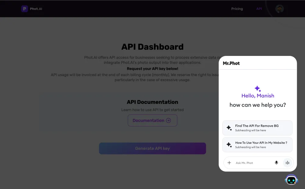 At Phot.ai, we believe building with creative tools should be as fast as using them. That’s why we created Mr. Pho, your real-time chatbot built right into the Phot.ai experience. Whether you’re a developer integrating our APIs, a product manager exploring tools, or a team lead automating visual workflows—Mr. Pho makes it simple. From finding the right tool to delivering ready-to-use API code, Mr. Pho takes the guesswork out of implementation.